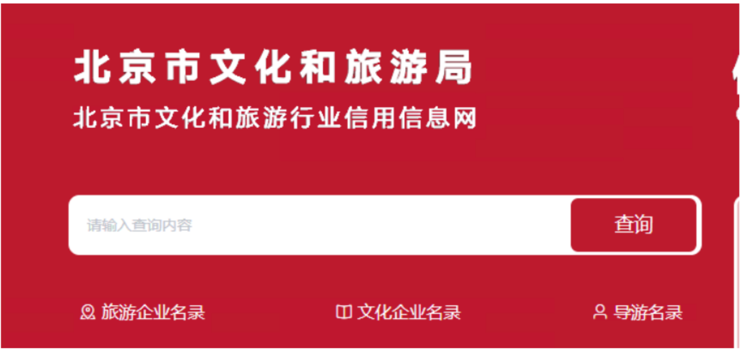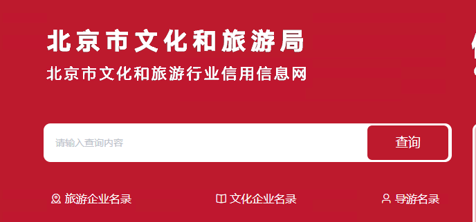 在北京市文化和旅游局官方网站点击“文化和旅游行业信用信息网”,进入后直接输入旅行社名称进行查询。