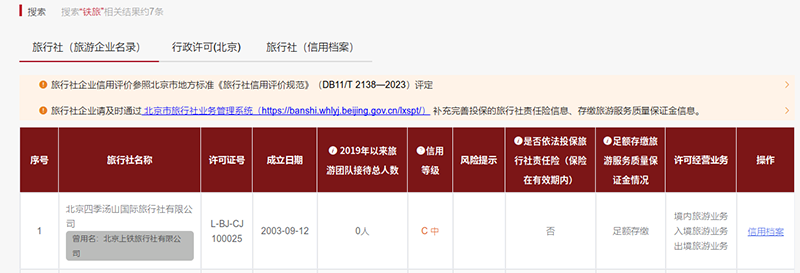 旅行社和消费者可通过北京市文化和旅游行业信用信息网,搜索旅行社名称,就可以查看到旅行社的名称、曾用名、许可证号、成立日期、接待人数、信用等级、风险提示,是否依法投保旅行社责任险、足额存缴旅游服务质量保证金情况、许可经营业务等信用信息。